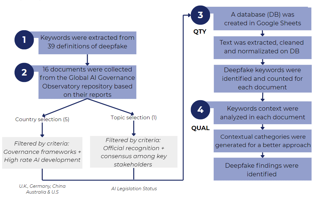 Figure 1. Methodology used in the project. This was divided into four stages, with two main nuances: document selection and textual analysis. 39 deepfake definitions were compiled to extract the keywords, as a starting point. Subsequently, five countries with regulatory frameworks and high AI development index were selected, according to the GIAIS (2025) and AGILE (2024) indexes. During the second stage; selected documents were collected and processed to extract and analyze their artificial content and manually, to identificate keywords related to deepfakes.