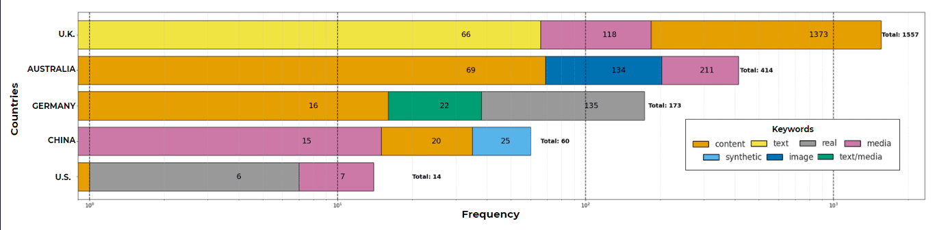 In the cases of Australia, Germany and the United Kingdom, many of the most frequent words identified in their documents -such as media, content or real- correspond to an abstract level, which means that they can be found in multiple contexts without necessarily alluding to deepfakes. Therefore, their presence does not imply a direct thematic focus on this technology. However, it is worth noting that one of the UK documents is the only one in the entire sample with the only mention of the word "deepfake."