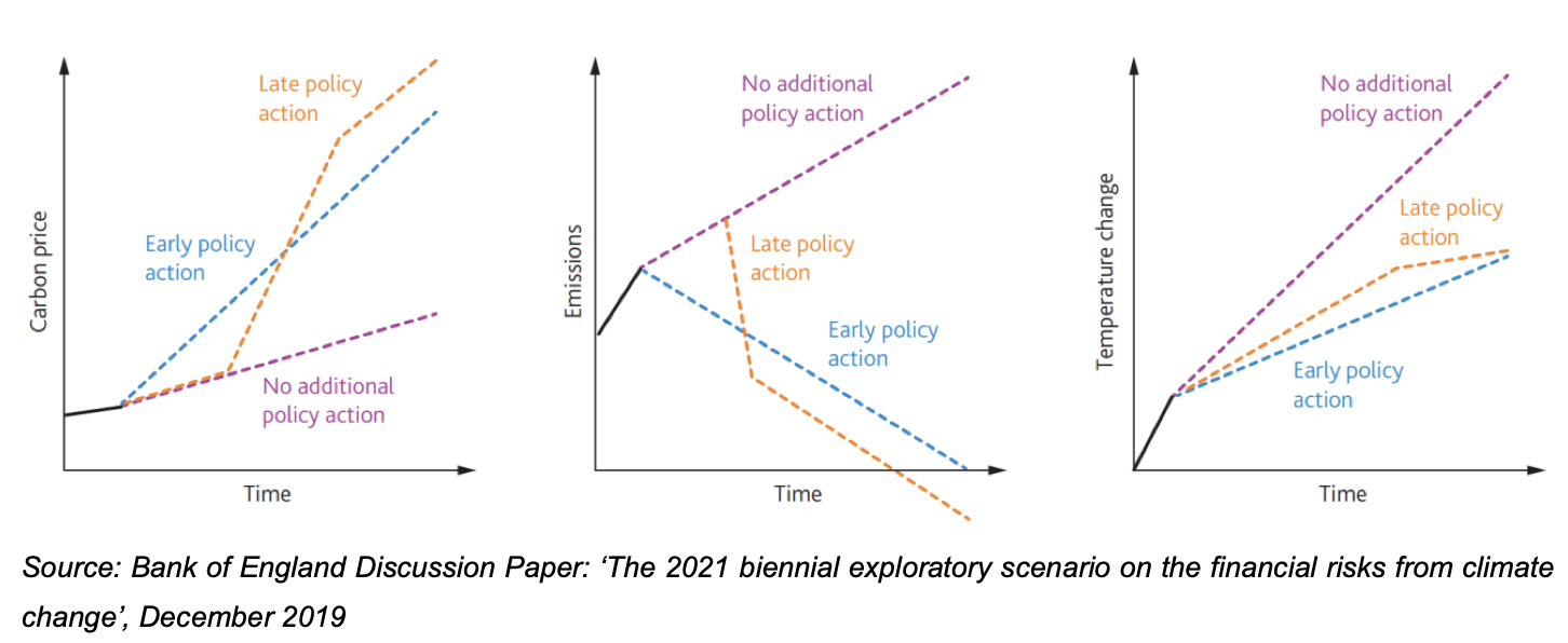 PRA’s 2021 Climate-related financial risk management and the role of capital requirements report includes charts showing the predicted changes in carbon price, emissions and temperature in the three scenarios: