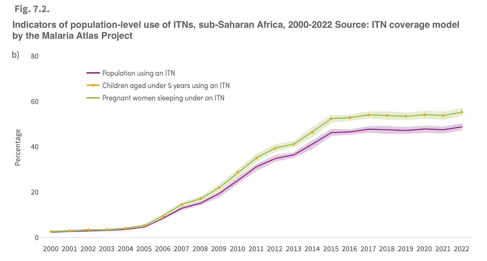 If you do some more complicated modeling to try to estimate usage in countries between surveys, you get the same picture according to the WHO and the Malaria Atlas Project: