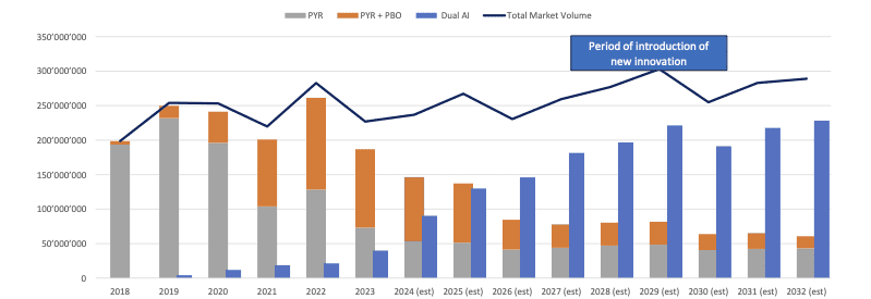 Here is a graph from the IVCC showing the number of different types of bednets distributed from 2013-2024 (and projected distributions through 2032) Gray is pyrethroid-only nets, orange is pyrethroid plus PBO, and blue is Dual AI: