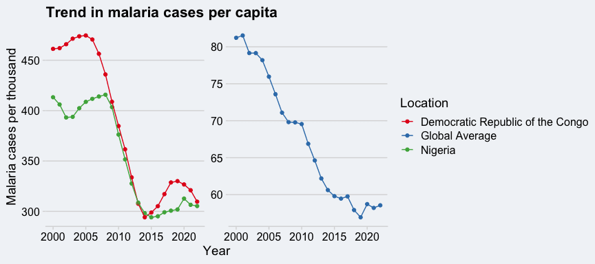 This is probably also a good place to point out that basically any statistics for the DRC, Nigeria, and most other countries with the highest rates of malaria are extremely uncertain. For example, there are concerns that the population of Nigeria may be overestimated by 25%. For this post, I’m taking the estimated numbers of malaria cases and deaths from the WHO at face value, but it’s worth keeping in mind that these are not counted, but are rather modeled based on malaria parasite prevalence. I didn’t dive into how the WHO comes up with these estimates.