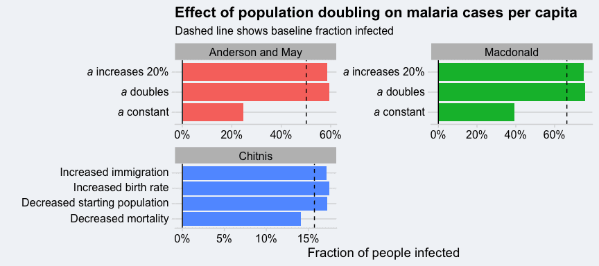 I also looked at two other older models of malaria transmission: the Macdonald model and the Anderson and May model. These models don’t explicitly keep track of the mosquito and human populations, but they do have a parameter for the number of mosquitoes per person. They also have a parameter (a) for the average number of times each mosquito bites any person each day. This ends up being a crucial parameter in these models, and its behavior when you double the population isn’t specified by the model. If there are far more mosquitoes than humans, then doubling the human population will cause a to double. But if there are far more humans than mosquitoes, then doubling the human population will cause no change in a (because mosquitoes are already biting humans as much as they can). So I tried three scenarios: a doubles, a stays the same, and a increases 20% (what you get using the Chitnis model).