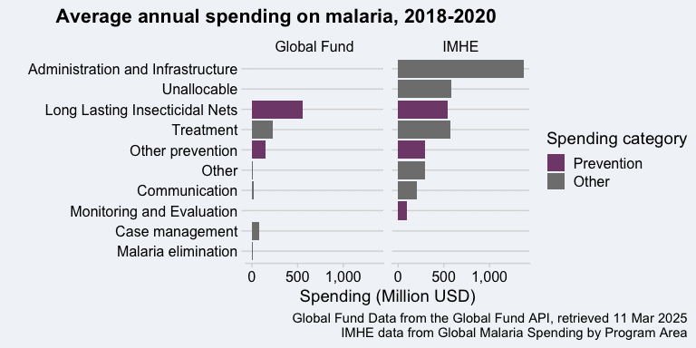 Both sources agree that bednets are the largest component of spending on prevention, but past that there are some large differences. Some of that is to be expected because Global Fund spending is just a part of what’s included in the IMHE estimates, but I think some of it also comes down to differences in accounting. I think some spending that the Global Fund would categorize as being spent on bednets IMHE is categorizing as administration of infrastructure. Either way, bednets account for the majority of all funding for preventing malaria.