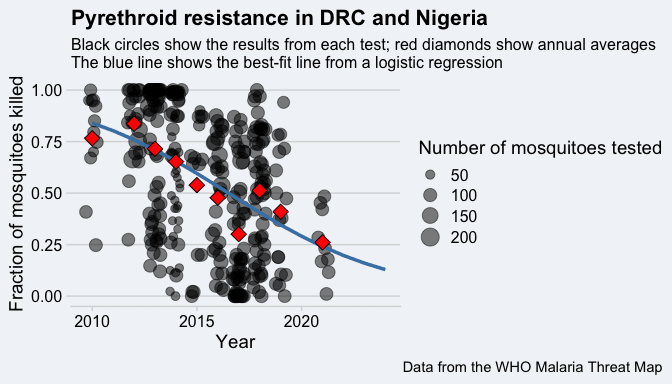 - If there wasn’t any insecticide resistance, this slope would be 33% larger. That’s a very crude estimate based on the results for the experimental hut trials.