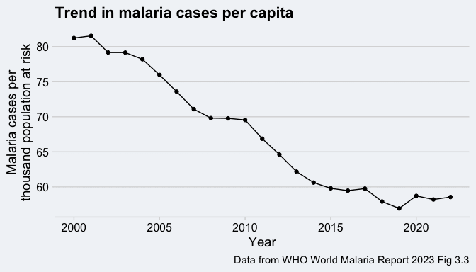 You could imagine a scenario where malaria control efforts were always very successful in some countries and ineffective in others. That could lead to a global decline in cases as we make progress in the successful countries, but once malaria was solved in those countries, no further declines would occur.
