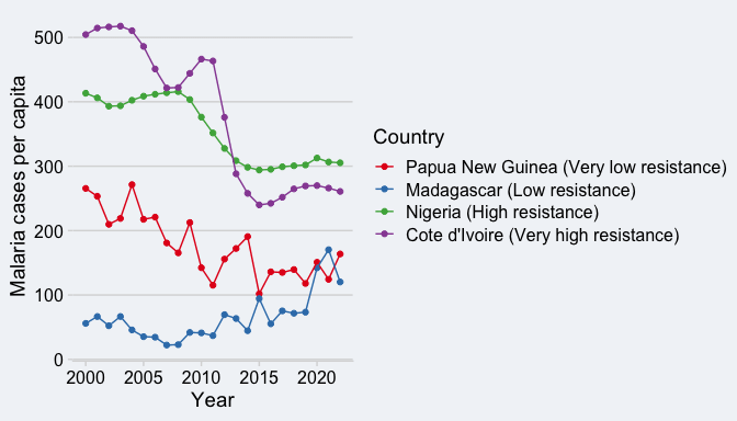 Papua New Guinea, Cote d’Ivoire, and Nigeria all show a decrease until 2015 and constant levels since then. Madagascar actually has an increase in cases per capita since 2015. I haven’t done an in-depth statistical analysis, so maybe there’s something buried under a lot of noise, but I can’t see any relationship between the level or intensity of pyrethroid resistance and the trend in malaria cases since 2015.