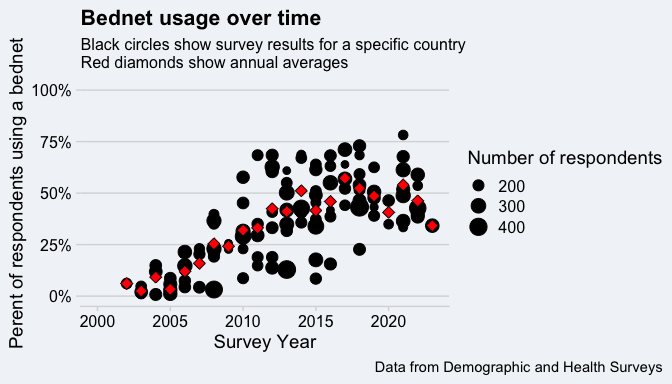 These results are all based on surveys, so “using a bednet” means that in a survey, a respondent said that they slept under a bednet the night before. So it’s possible that these results are biased and there actually is a decreasing trend in usage over time, but I think the simpler explanation is that bednet usage is staying the same.