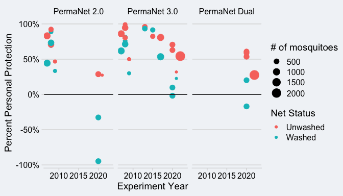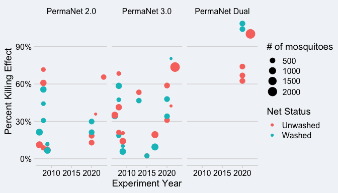 I focused on the PermaNet over other types of nets because that also let me check whether these nets show a decline in efficacy after Vestergaard removed PFAS from the nets in 2012 (more about that later).