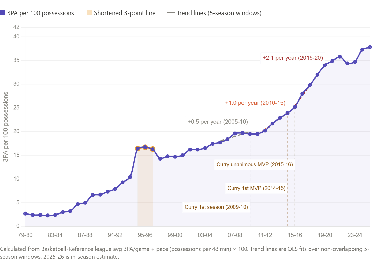 Nobody else yet has come close to joining Steph all the way out at the long-range volume-efficiency frontier. Not for lack of trying: general managers wantonly drafting wannabes, coaches giving them the green light, and everyone chucking with gleeful abandon. The 3-point attempt rate leapt from 23.9 per 100 possessions in Steph’s first MVP season to 34.0 five seasons later. In a copycat league, the time when the game changed beyond recognition, and sharpish, wasn’t when three being greater than two became knowable, or known, or written down, but when it rained down, night after night in glorious high definition, as the greatest show on earth, and ended in a parade.