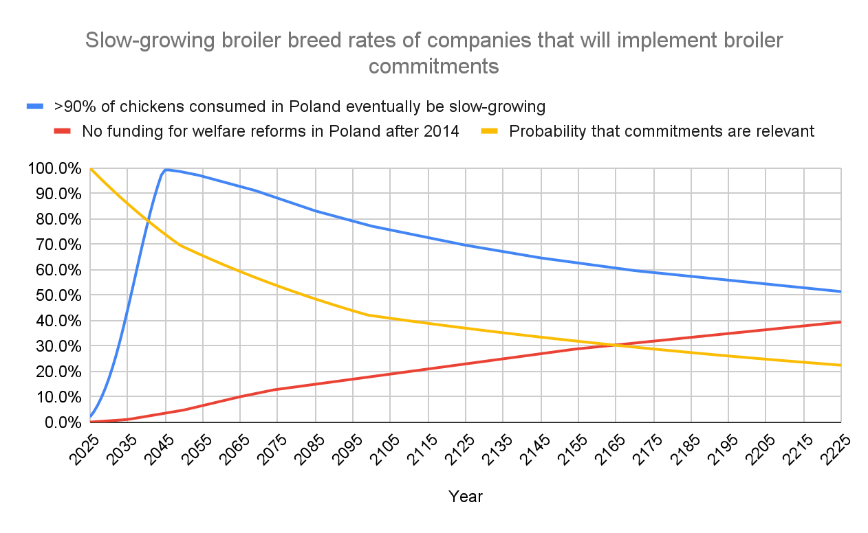 - Broiler commitments: This campaign seeks corporate pledges to improve the welfare of chickens farmed for meat (broilers). Only a few commitments have been secured in Poland so far, and none have been implemented yet. Almost all of the expected future impact in my estimates comes from an assumed 3% chance that slow-growing broilers will eventually become the industry standard in Poland.