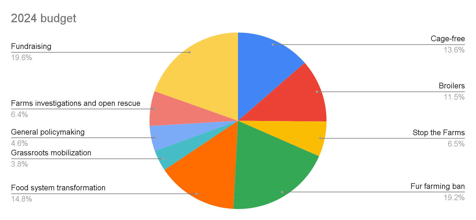 - Expenses for chicken farm investigations are included under the broiler and cage-free program budgets, as they directly support those campaigns.