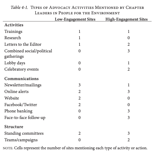 “The starkest difference emerges in mentions of combined social and political gatherings. All three high-engagement entities in People for the Environment organize such events, while none of the low-engagement entities do. Combined social-political events include happy hours, dinners, coffees, and bike rides that seek to accomplish an explicitly political goal, but do it in a way that combines socializing with advocacy work. Leaders at high-engagement entities were also more likely to mention lobby days, in which they organize groups of activists to go to the state capitol and lobby legislators, and celebratory events, in which activists working on a project get together to celebrate and debrief at particular benchmark points.”