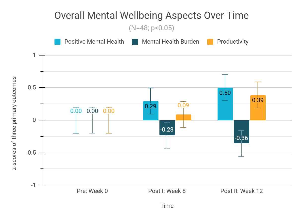 To measure the program’s effectiveness, we used a standardized self-assessment that employs common psychometric scales.[4] Participants filled out a 30-minute Wellbeing Evaluation Survey once before the program and thrice more over 16 weeks. We also used a shorter Weekly Program Evaluation to enable real-time improvement.
