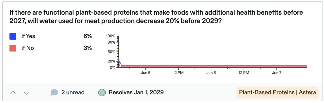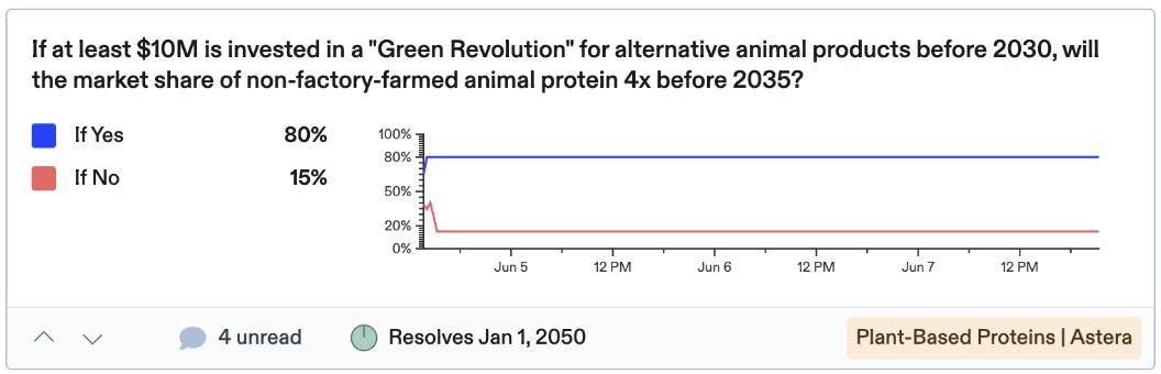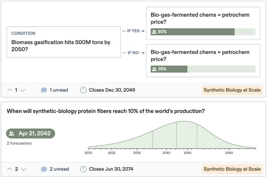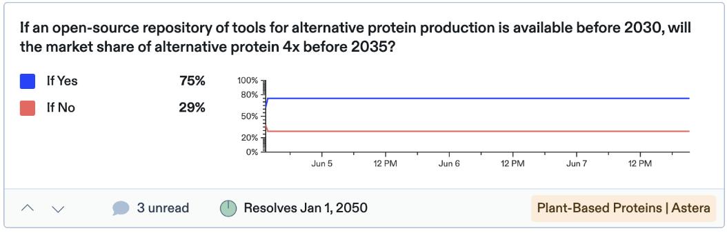 To equip our participants with forecasting abilities, we brought in several forecasting experts to teach the basic skills. Then, participants were asked to forecast on conditional questions. Conditional questions ask, “if we achieve this, what will happen” and then “if we don’t achieve this, …”. The benefit of conditional forecasting is that it provides an estimate of the size of the impact if you achieve the goal. For example, you can see in this example the forecast that open source tools for protein production will have a significant impact on making alternative proteins competitive in the market.