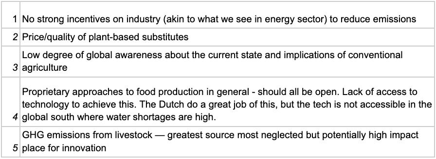 Bottlenecks are the impediments to achieving the selected objective. For this, we asked each participant to generate bottleneck suggestions, and then to (blindly, without looking at others’ inputs) estimate the average size of the impediment to the objective, and then sorted them by the largest mean impact. The ability to see one another’s scores in the final step permitted participants to discuss the difference in their estimates and provide adjustments. This part of the process worked pretty well. From those, the most impactful bottlenecks were chosen.