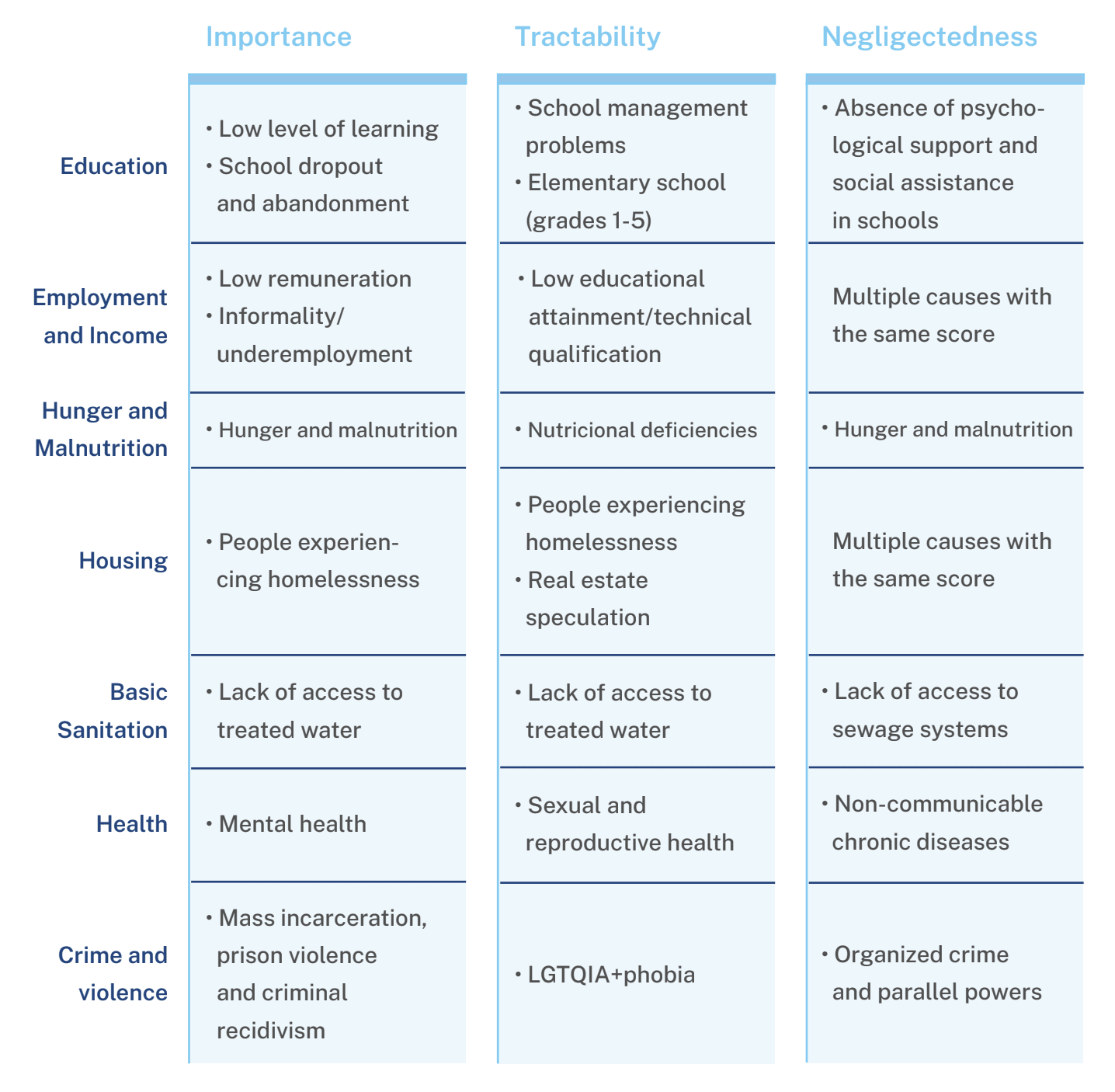 Since the ultimate goal of this study is to identify the three most strategic causes, we needed to compare the causes across different areas. To this end, we conducted a new round of evaluation starting from the top-ranked causes in each area, still using the ITN criteria through the analysis of public official indicators, research, and news, and subjective evaluations by the doebem team, board, and volunteers. This new round indicated that the three most strategic causes were, in this order, Non-communicable chronic diseases (Health), Hunger and malnutrition (Food Insecurity, Obesity, and Malnutrition), and Lack of access to treated water (Basic Sanitation).