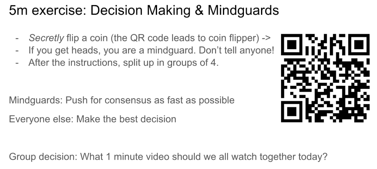 But exercises can also be more complicated, like this simulated game of adversarial groupthink (“mindguard” is a term invented by Irving Janis to point to individuals who actively increase groupthink in a given group).