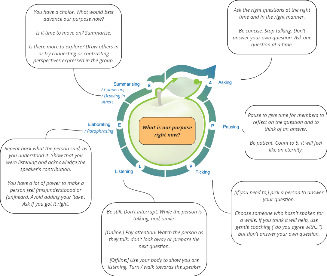 One model of facilitation adapted from Jones (2020) Mastering Facilitation is APPLES, which provides a basic cyclical process framework for group discussions. It involves Asking questions, Pausing for thought, Picking a person, Listening to contributions, Elaborating on what a person said, and Summarising contributions from people. We adapted APPLES to be less strict, and also provided some elaboration on each stage. The ‘core’ of the adapted APPLES process is to consistently reflect on the question: “What is our purpose right now?” Keeping the group’s purpose in mind can help a facilitator what kinds of questions to Ask, who (or whether) to Pick, what themes to emphasise when Summarising, etc.