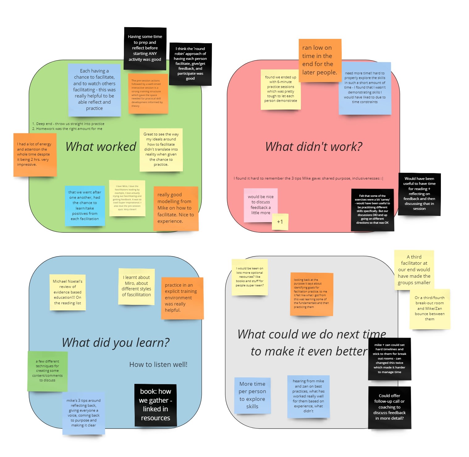 Mini-retrospectives were especially useful for us to adjust our approach between sessions, such as by tweaking an activity, or including an additional exercise for participants to complete.