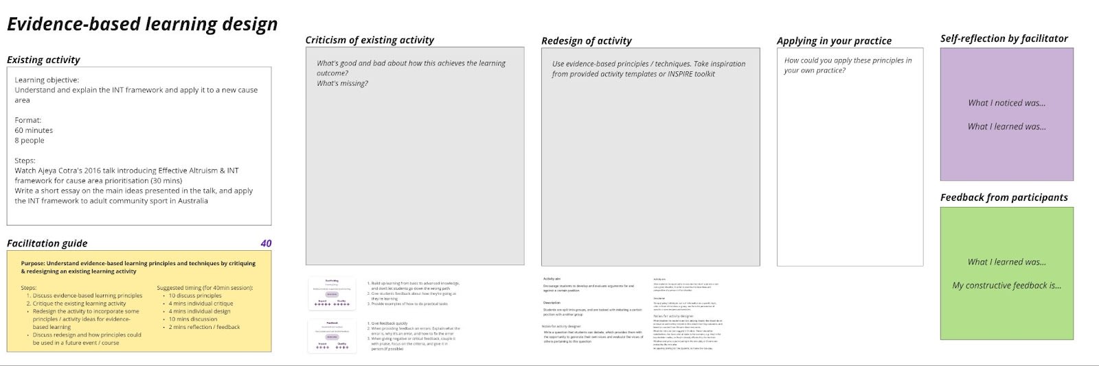The purpose was to understand evidence-based learning principles and techniques by critiquing & redesigning an existing learning activity. Over a 40 minute block, one participant took the role of facilitator and led the constructive criticism section for 15 minutes. Then, they swapped roles and another participant facilitated the redesign section and how to apply the principles to future events or facilitation practice in general. Finally, all participants spent time providing feedback to the participants who took on the role of facilitators.