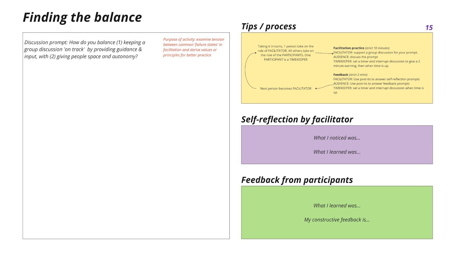- Most participants were not complete beginners in facilitation, so we could skip basic introductory content, and also include activities that asked participants to reflect on previous facilitation experiences.