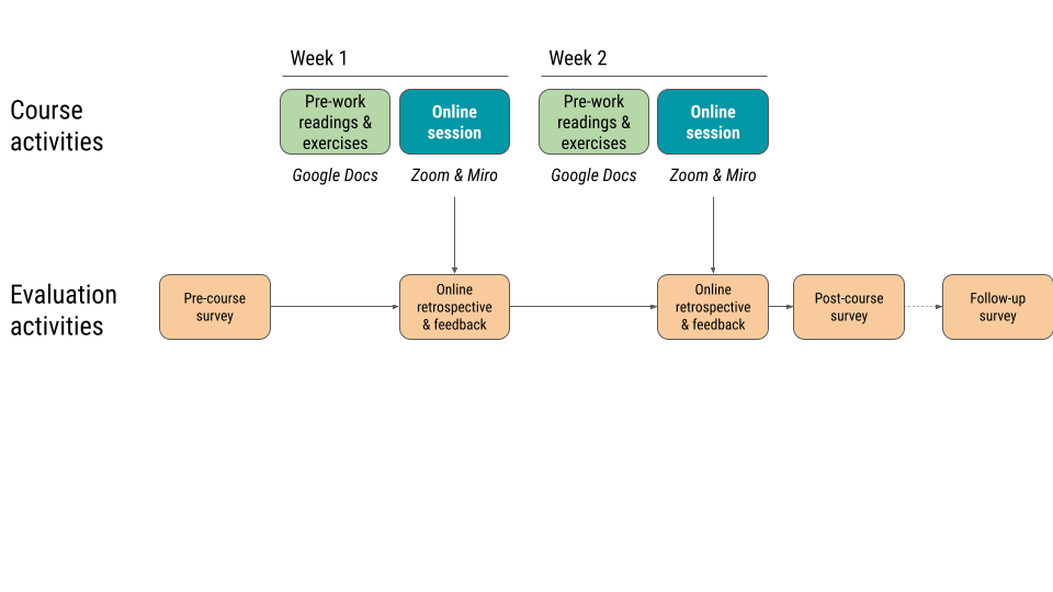 We conducted more than one type of evaluation to try and make the course as useful as possible for participants. We drew on our significant experience in teaching, supervising, facilitating, and consulting to (1) test our assumptions about the participants and their needs, (2) collect data during the course to follow-up with participants and/or make adjustments to the course materials to maintain engagement; (3) measure the impact of the course for helping participants improve their facilitation practice.