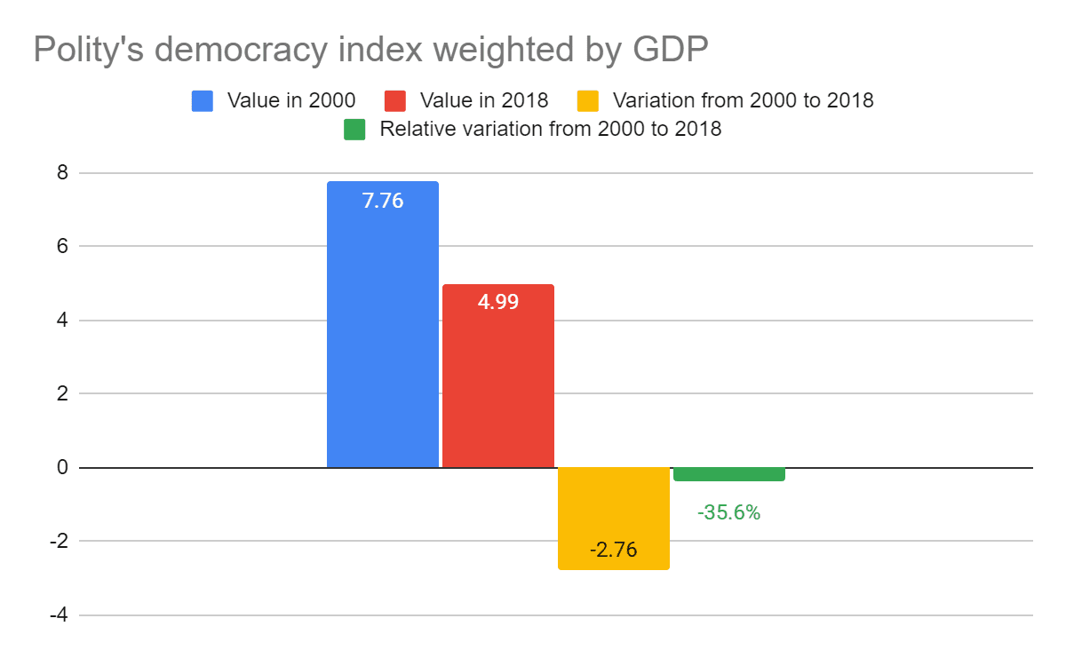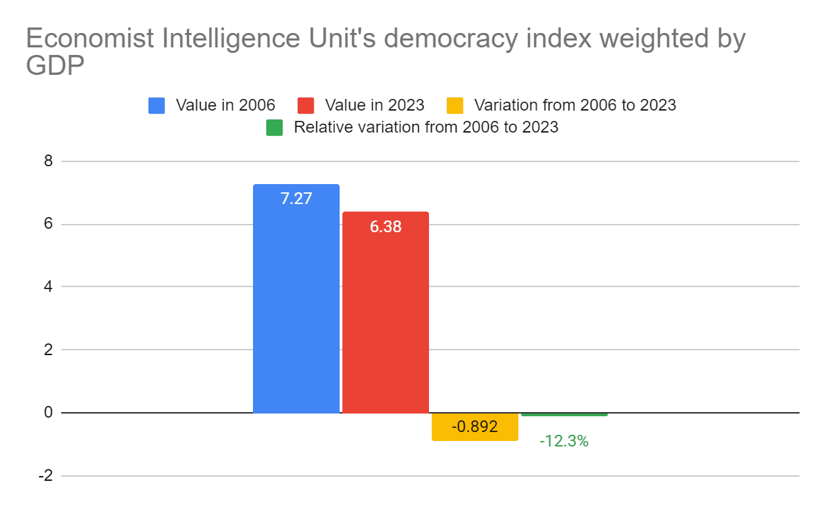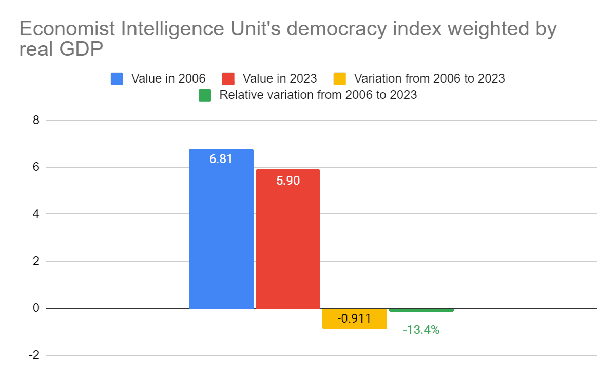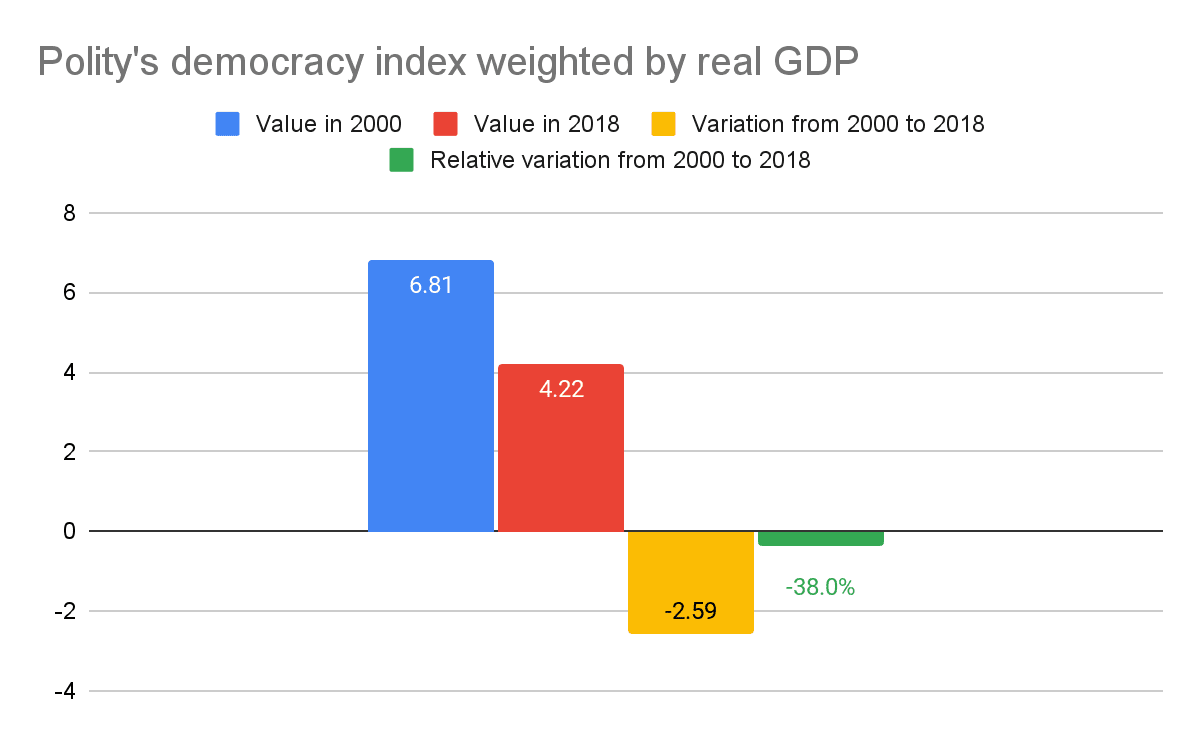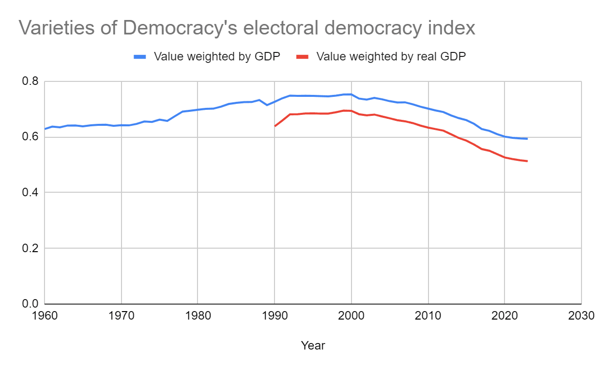 OWID has a post showing the number of democracies, people living in them, and democracy indices weighted by population have recently gone down. I think economic size is a better proxy for influence than the number of countries or population, so I looked into the variation of democracy indices weighted by nominal and real GDP.