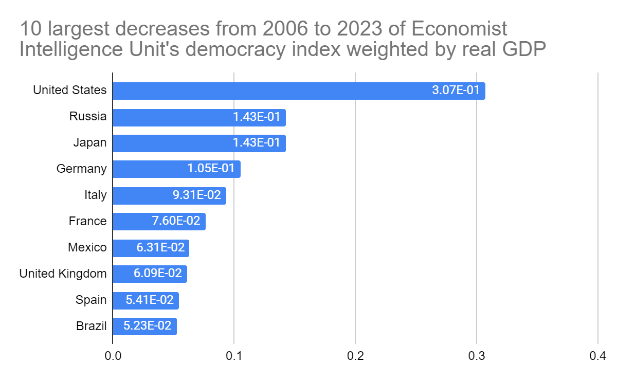 - The decrease in Economist Intelligence Unit’s democracy index weighted by GDP was mostly driven by the United States, Japan and Germany, which had the 1st, 3rd and 4th highest real GDP in 2023.