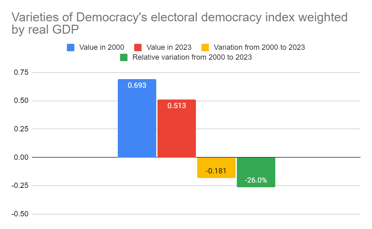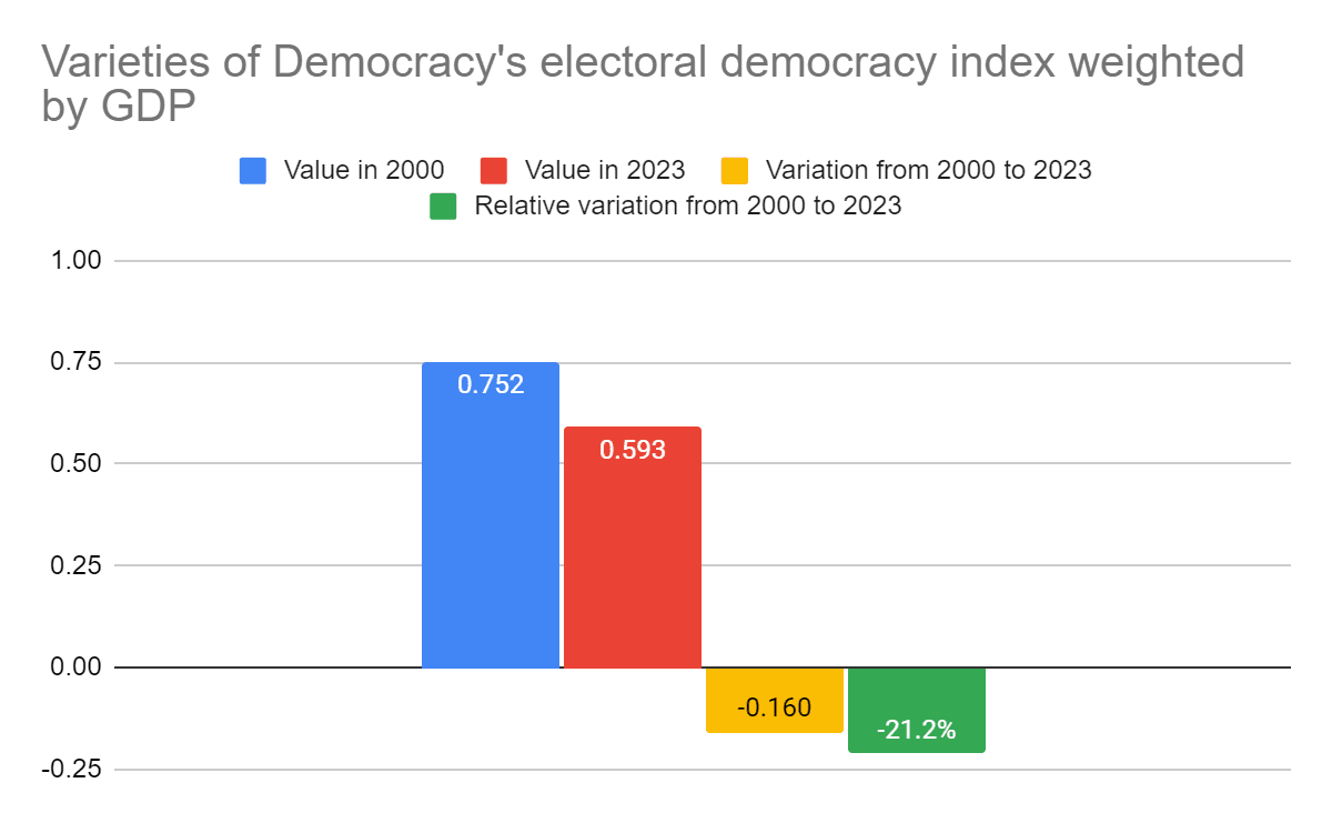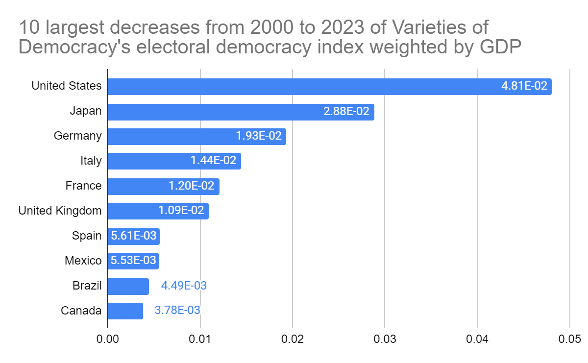 - The decrease in Varieties of Democracy’s electoral democracy index weighted by GDP was mostly driven by the United States, Japan and Germany, which had the 1st, 3rd and 4th highest GDP in 2023.