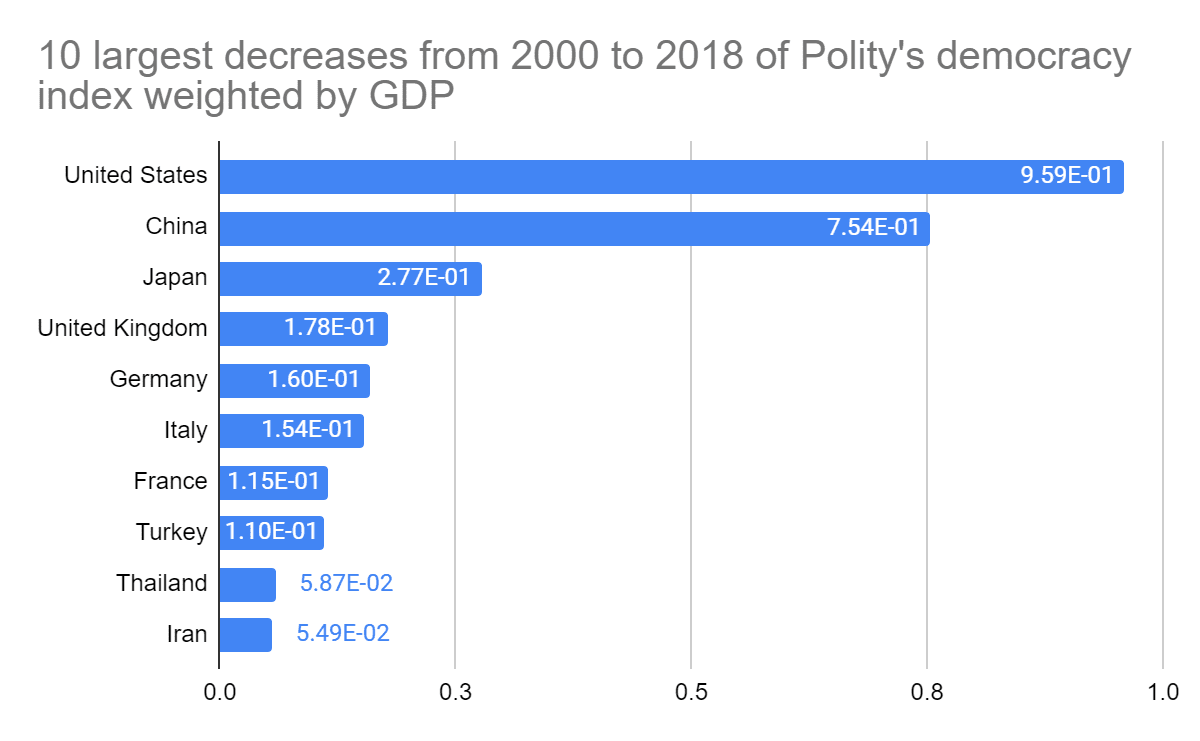 - The decrease in Polity’s democracy index weighted by GDP was mostly driven by the United States, China and Japan, which had the 1st, 2nd and 3rd highest GDP in 2023.