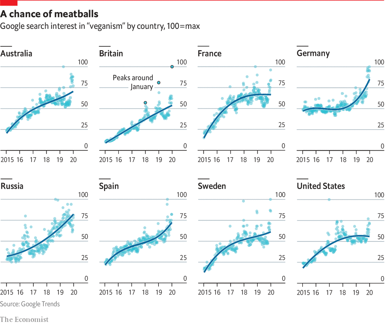 Also, this January spiking pattern had been most clear and pronounced in the UK, where Veganuary has been most active (from the Economist):