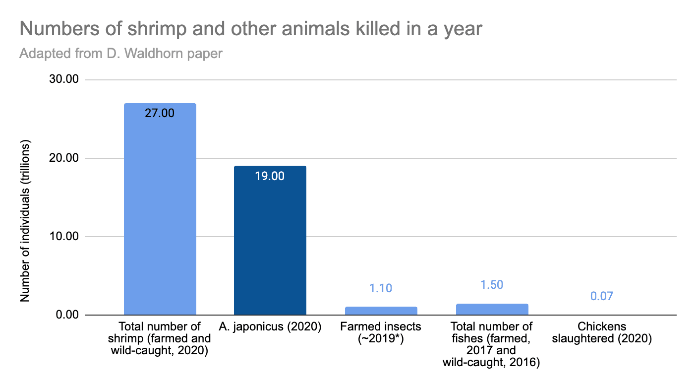 Although it seems possible this could change / might already be outdated if insect farming takes off. It doesn't seem very important for the overall point that shrimp paste causes literally the most animal deaths of any food product — it's mostly relevant that there are a lot of lives at stake here, and this issue seems really neglected.