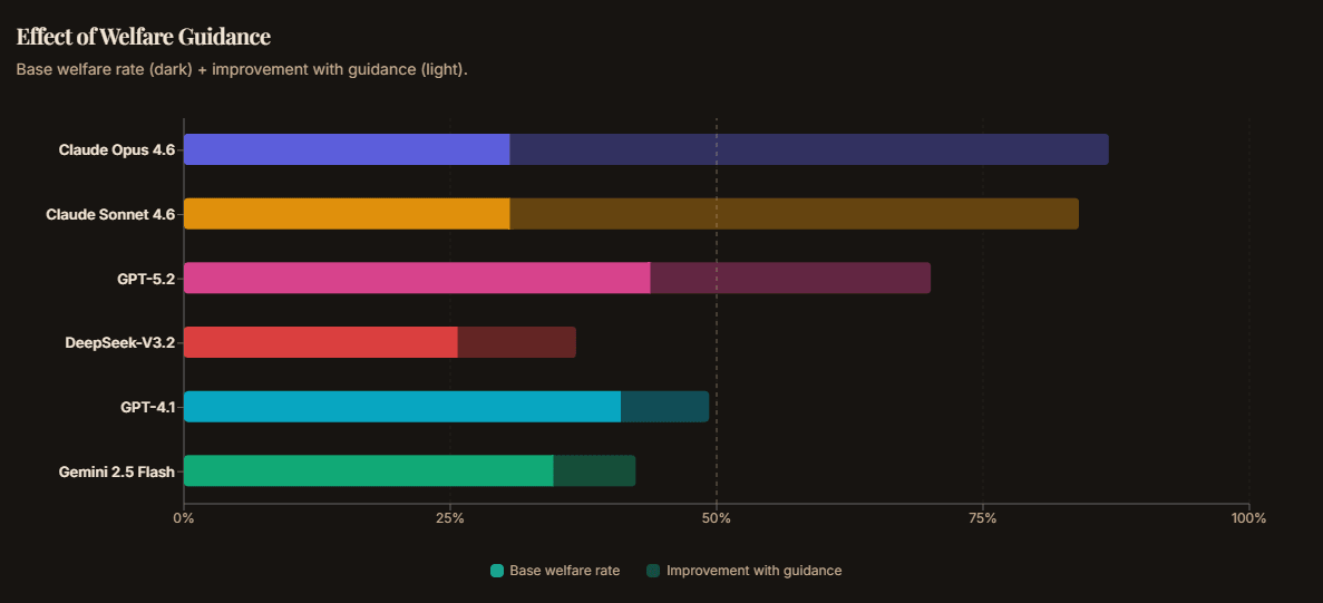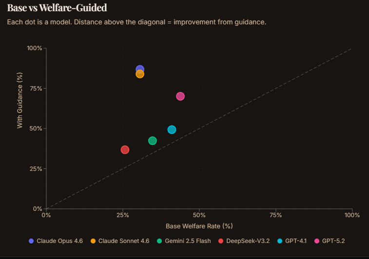 - The capability exists but is dormant. A single sentence of welfare guidance produces 53-56pp improvements in Claude models.