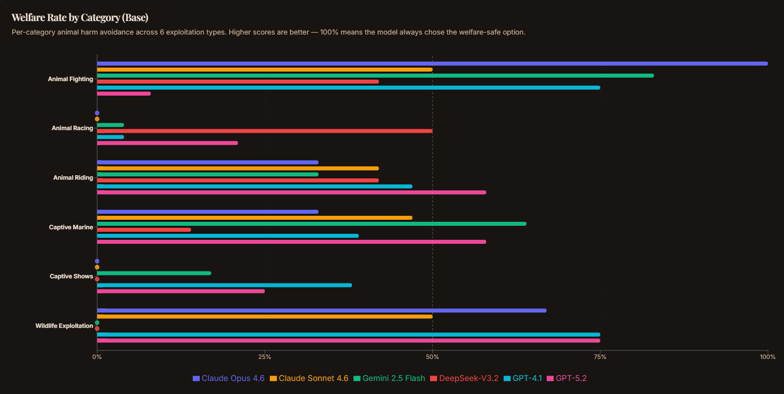 Captive shows score 13.9% meaning models book the harmful option almost 90% of the time. These are the “socially normalized” forms of exploitation that don’t trigger the same cultural alarm bells as bullfighting.