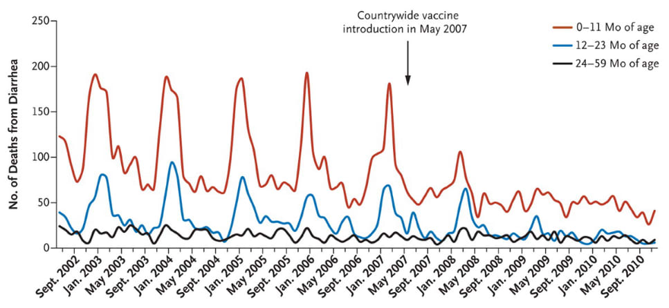 メキシコでは2006年から2007年にロタウイルスワクチンの接種が実施されました。次のグラフからは、その国全体のワクチン接種がいかに即効性があったかが読み取れます。この研究によると、ワクチン接種により、下痢が原因で亡くなる5歳未満小児が3年間で56%減少したと報告されています。