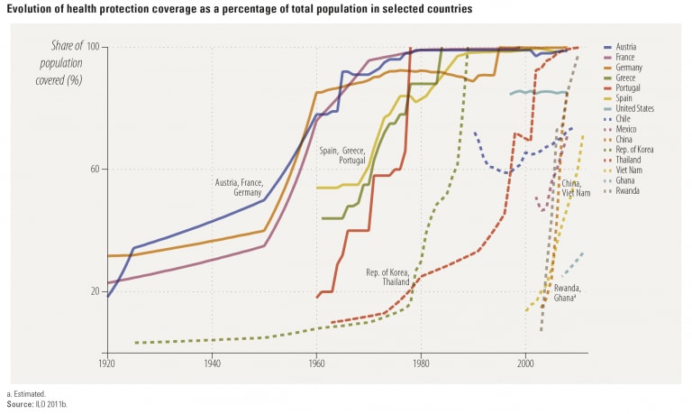 前述の通り、20世紀前半には、ヨーロッパ諸国は世界に先駆けて医療制度を拡大させていきました。次の図(国連開発計画(2014年)の報告書より引用)は、その成果が表れています。1920年から2010年の間の成長は目覚ましいものです。フランス、オーストリア、ドイツでは1920年から1960年にかけて、スペイン、ポルトガル、ギリシャでは、1960年から1980年にかけて被保険者層が大きく拡大しました。興味深いことに、医療保険制度における後発国で急拡大した事例もあります。特に中国、ルワンダ、ベトナムでは、21世紀に医療保険制度をほぼゼロの状態から立ち上げ、わずか10年で国全体をほぼ完全にカバーすることに成功しています。この実例から、医療保険制度は急速に拡大させることが可能であり、また高水準で普及させることが可能であることがわかります。