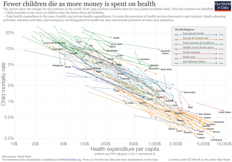 矢印が示す経年の変化に注目すると、顕著な事実が浮かび上がってきます。子どもの死亡率が最も低い国と、最も高い国々の間には、百倍近くの差があります──その差は驚くほど安定しています。傾向に注目してみると、これらの大きな差がある国々の間に不均一性はみられません。ヨーロッパの裕福な国も、アフリカの非常に貧しい国も、医療支出の増加に伴い、子どもの死亡率は下がっており、同様の傾向が際立っています。
