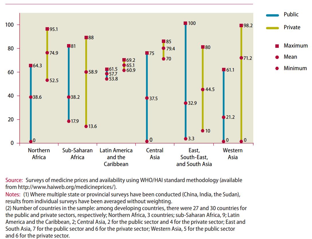 いくつか注目すべき傾向があります。まず、発展途上国では、公共部門からの医薬品入手が困難であり、27ヵ国間の入手可能度の平均はたったの35%です。それに対し、民間部門での入手可能度は、公共部門と比べて一貫して高い傾向にありますが、これも保証されているわけではなく──というのも、医薬品を十分に入荷できる民間業者も全体の3分の1を少し上回る程に限られているからです。[16]