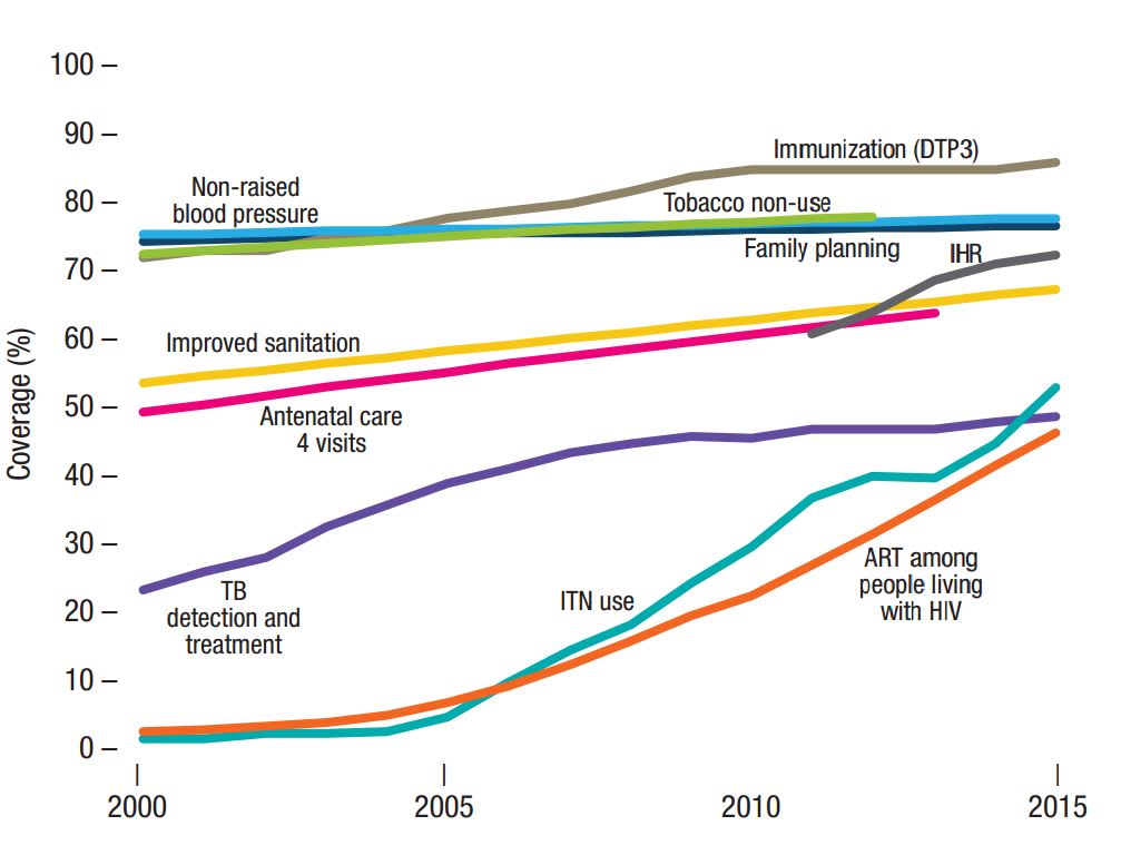 表内の各項目については、それぞれ次の通り。TB detection and treatment (結核の発見と治療)、ITN use(殺虫剤処理された蚊帳の使用)、ART among people living with HIV(HIV感染者への抗レトロウイルス療法)、IHR(国際保健規則)、Anatenal care 4 visits(妊産婦ケア・4回の診察)、Improved sanitation(衛生環境の向上)、Family planning(家族計画)、Tobacco non-use(禁煙防止・治療)、Non-raised blood pressure(高血圧の治療) Diphtheria-tetanus-pertussis vaccine(ジフテリア・破傷風・百日咳の予防接種;三種混合ワクチン)