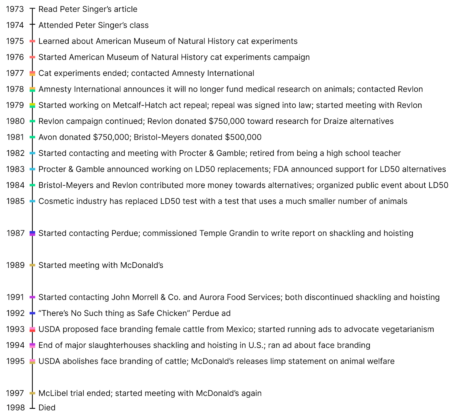 Timeline of Henry Spira’s animal advocacy based on the biography. The Perdue campaign was unsuccessful, and the book was written when Singer and Spira were waiting to see McDonald’s response. Besides these two outliers, Spira’s quick and regular successes are impressive.