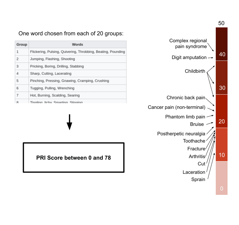 Here is a visual summary of how the McGill Pain Index PRI scores are calculated, as well as some typical scores associated with human health conditions. I do assume, but I haven't checked, that the scores would vary somewhat from person-to-person and depending on the specifics of the condition. This is illustrated with childbirth, which is given three scores (the pain varies depending on the experience and preparation level of the birthing parent).