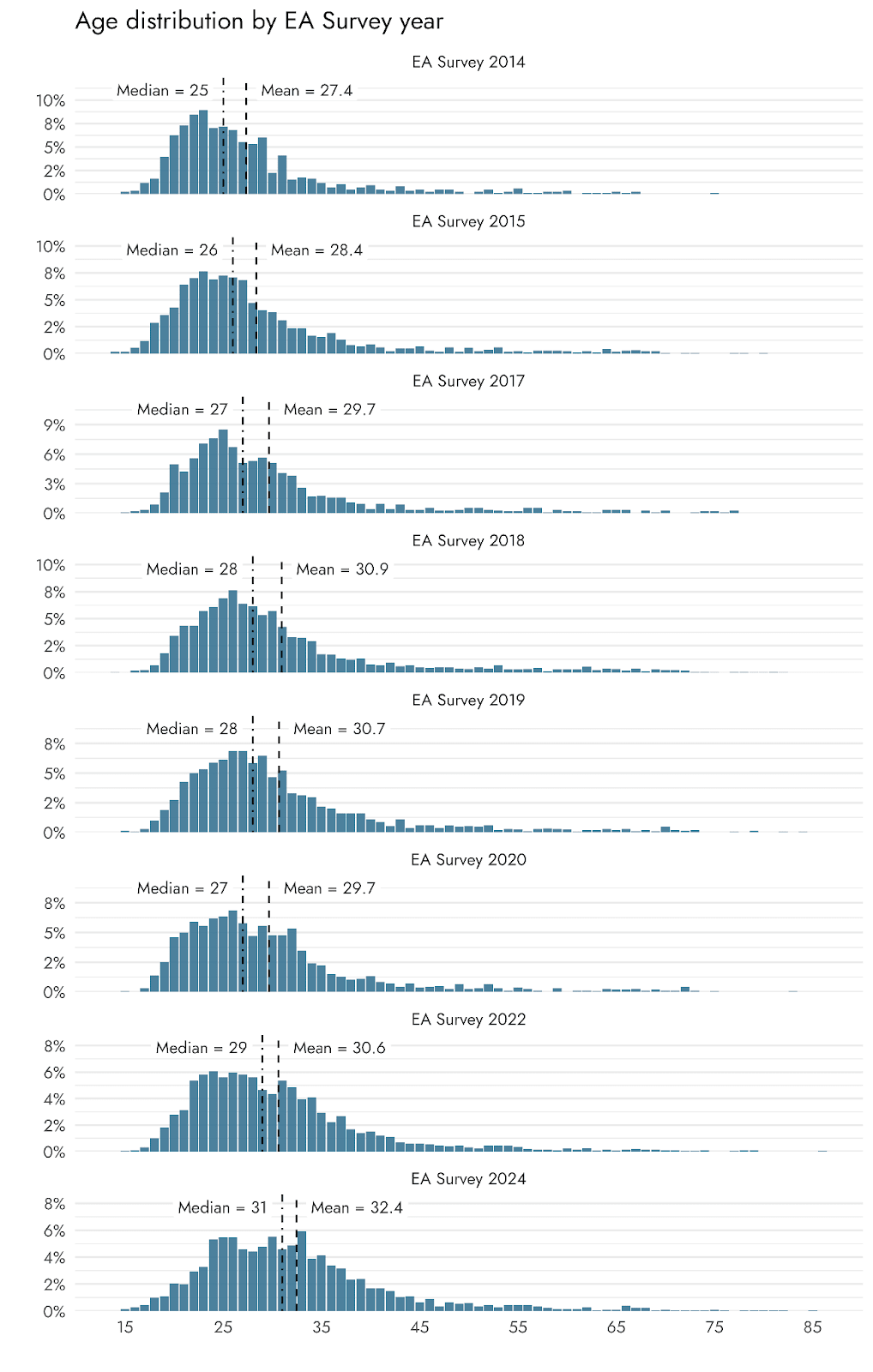 The Effective Altruism movement remains notably youthful. According to the EA Survey 2020, participants had a median age of 27 (mean 29).