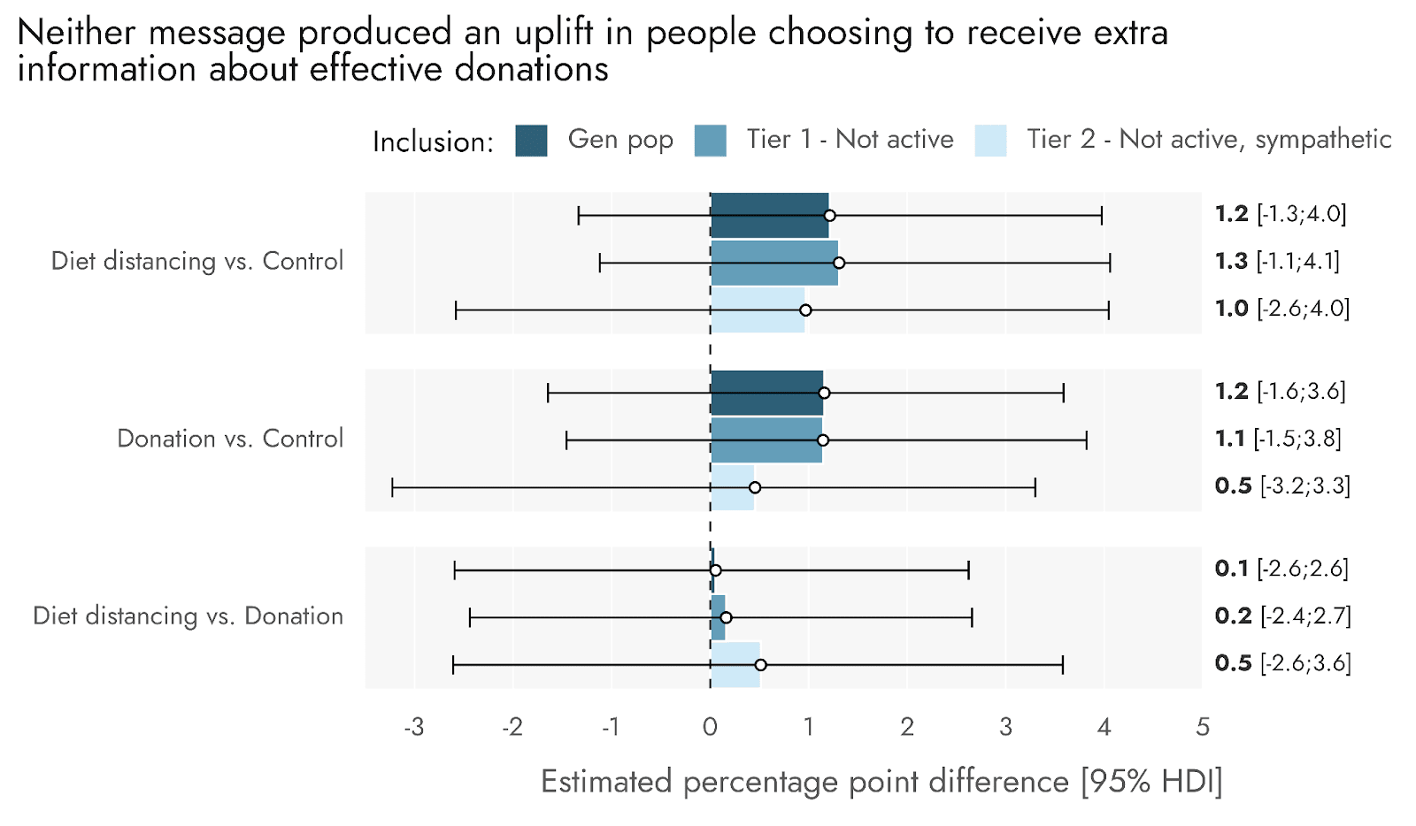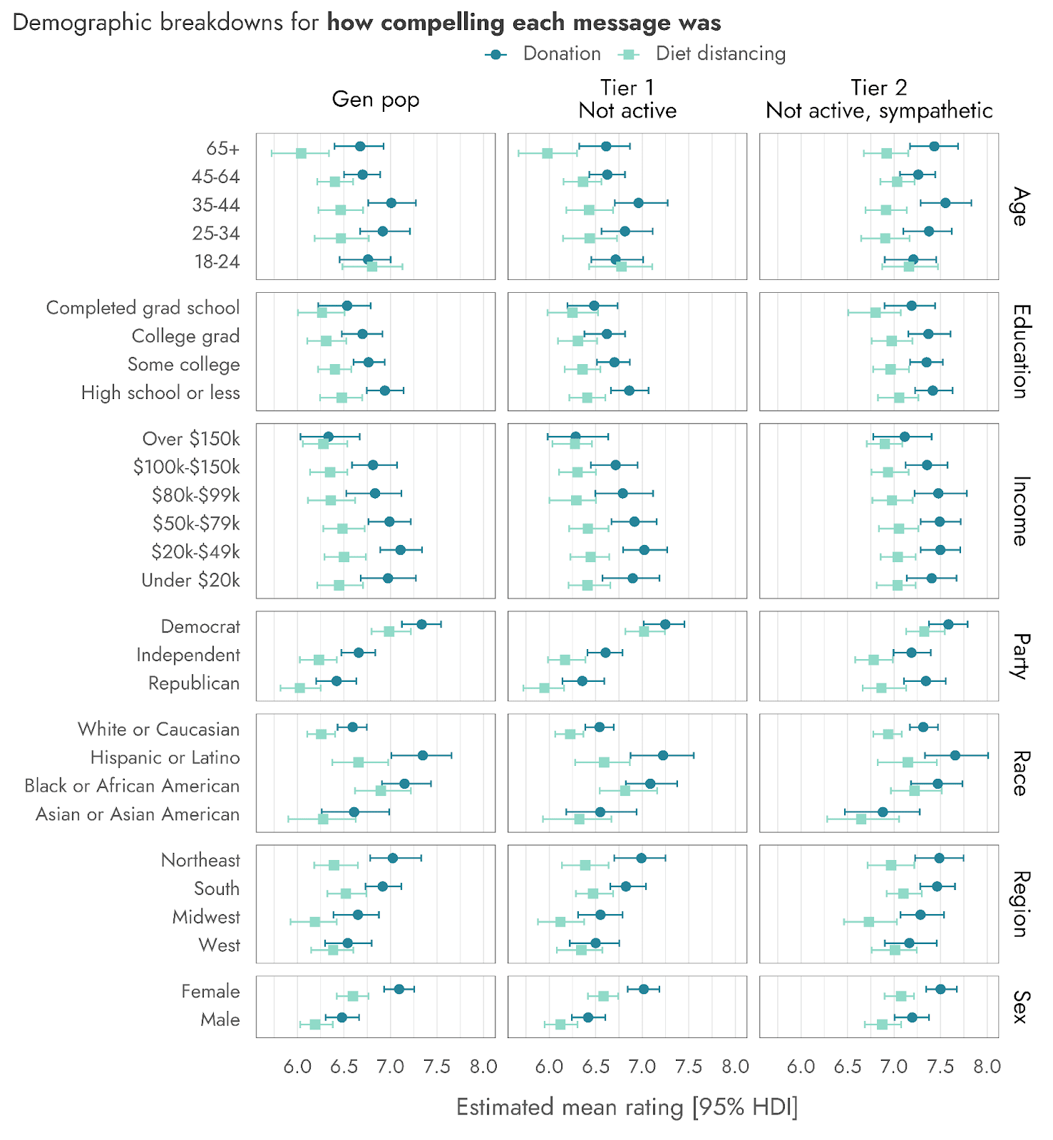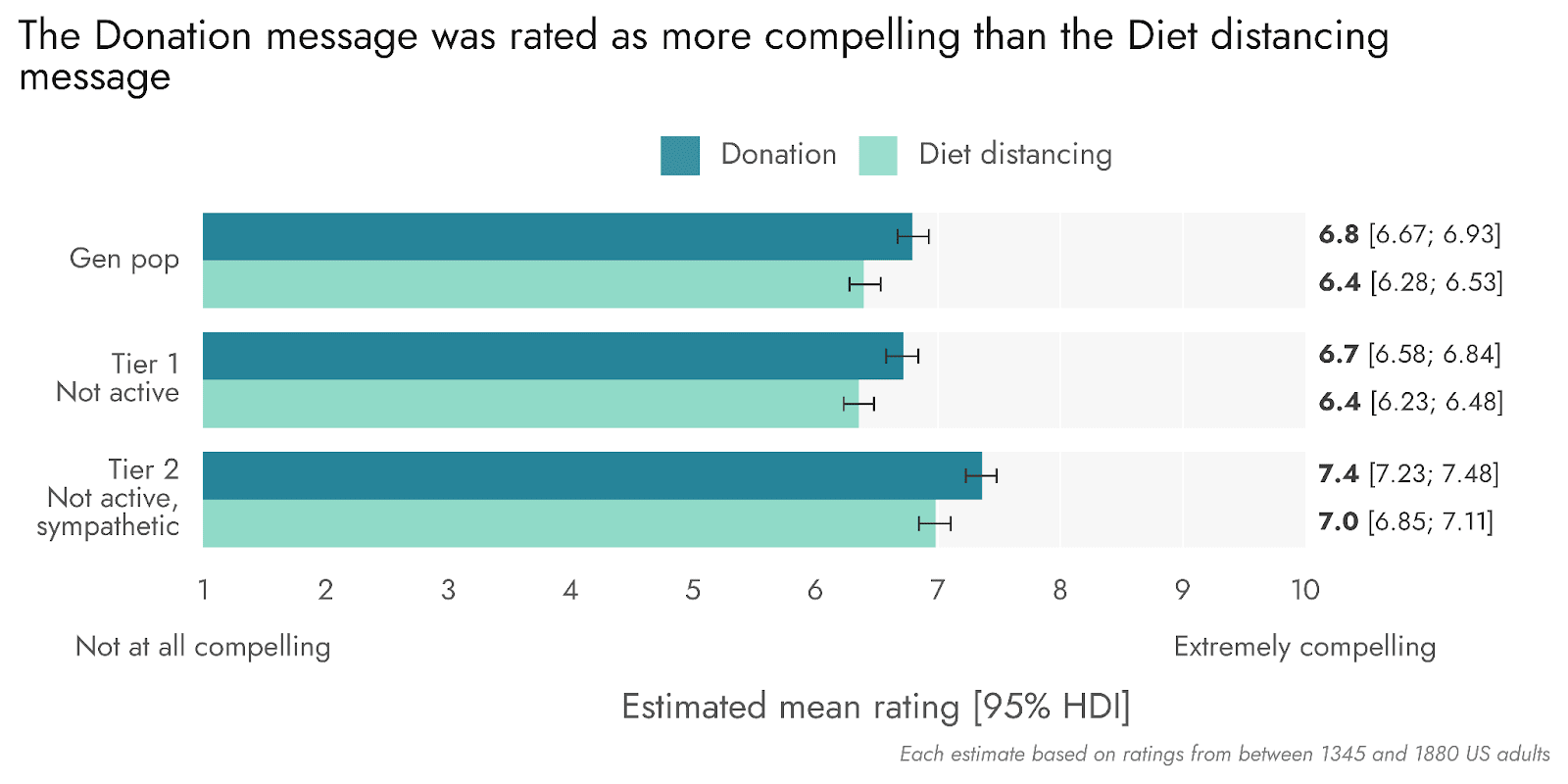 - Strategic implications (reach vs. conversion): “These findings have influenced our website messaging, with us avoiding referencing diet much on our home page. However, while explicit ‘diet distancing’ was slightly less compelling to the average respondent, it can still be the right choice in certain contexts. Often, addressing the ‘elephant in the room’ makes for a far more interesting story to podcast hosts and content creators and can reassure them that we're not going to alienate their audience by telling them to change their diet. When addressing the diet ‘elephant in the room’ can unlock orders of magnitude more reach, this can easily outweigh a small dip in conversion per person. We are encouraged to see that the study did not find that promoting donations crowds out interest in diet change; in fact, it may even slightly increase it.”