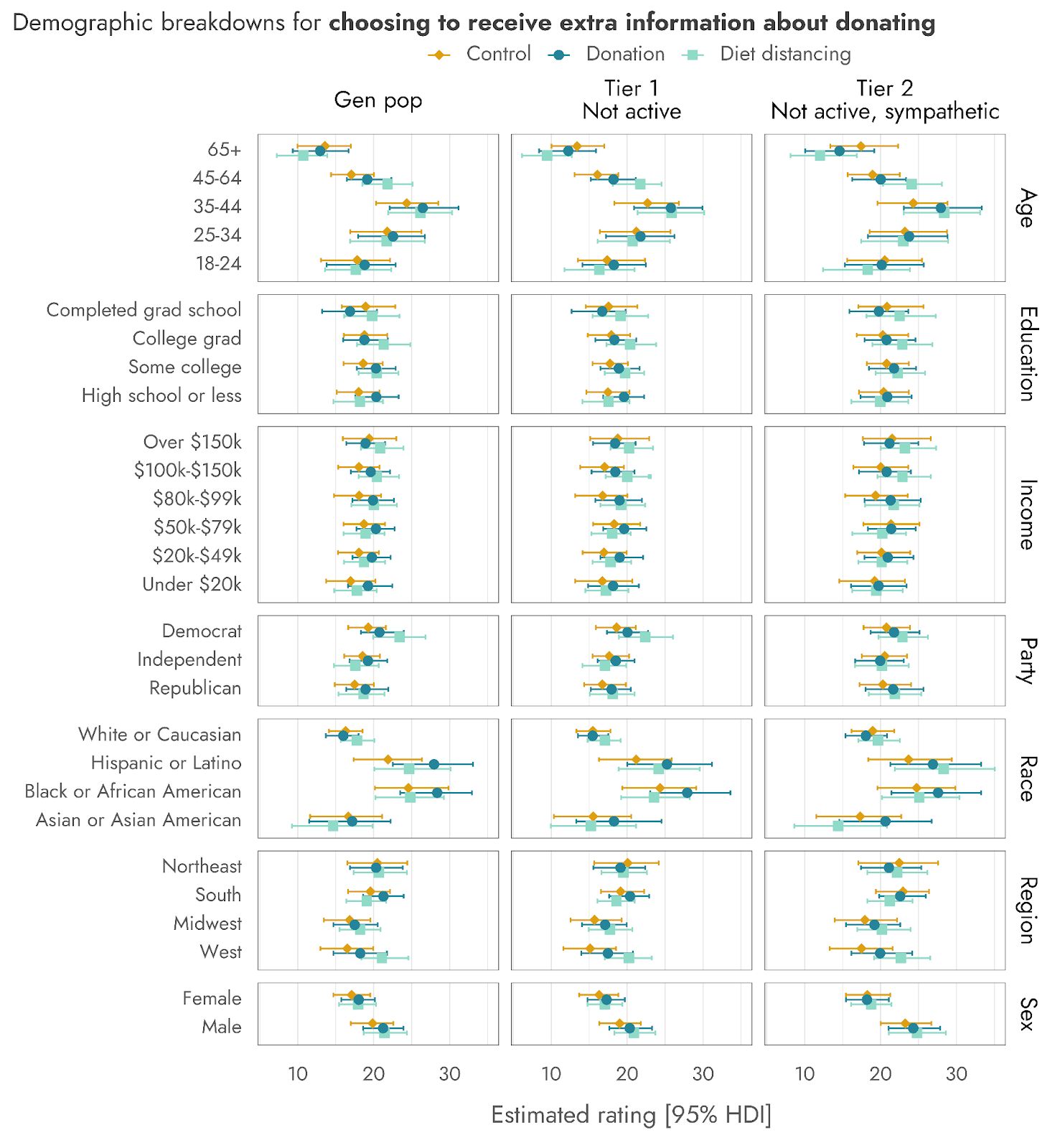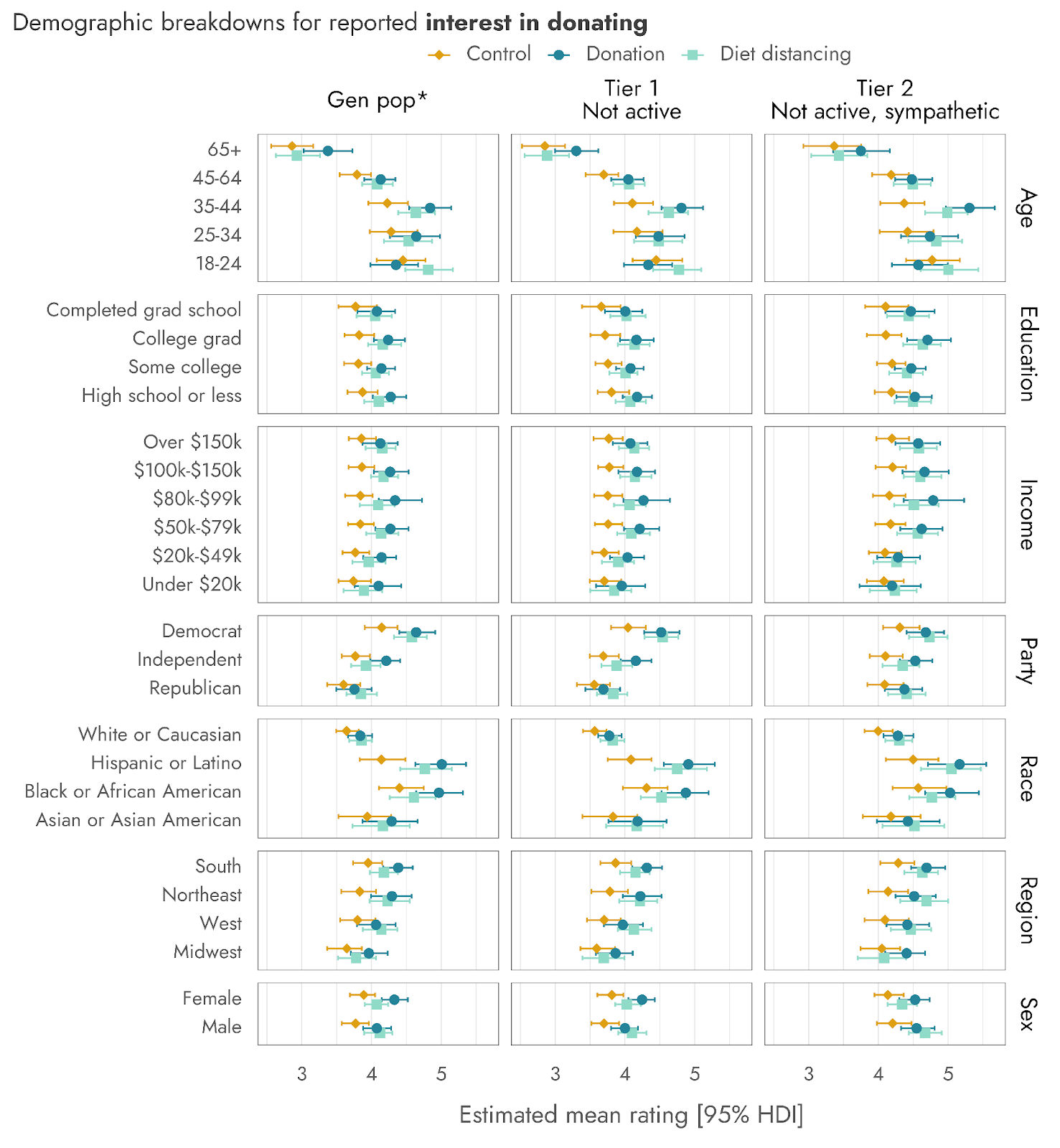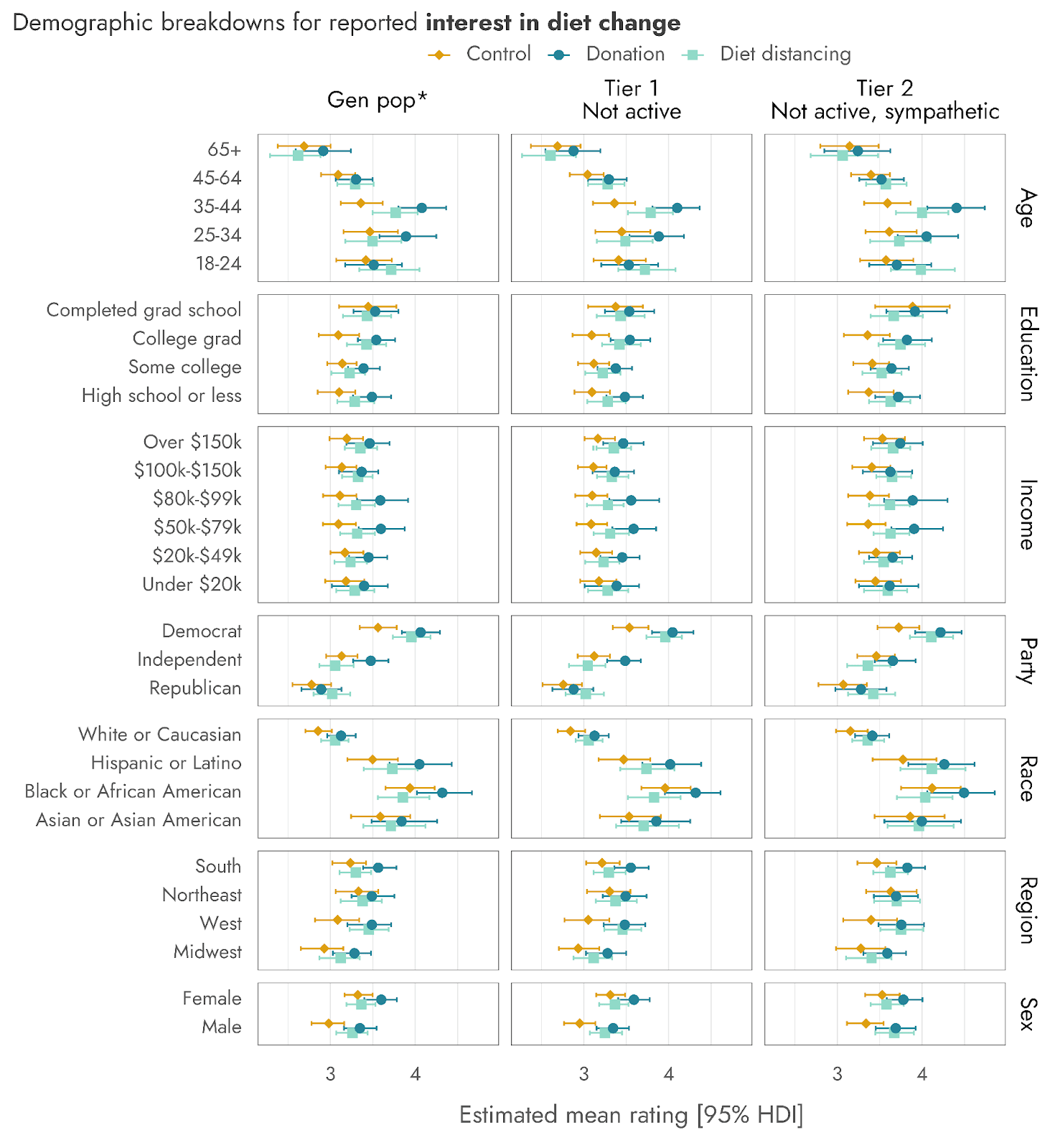 - Strategic implications (reach vs. conversion): “These findings have influenced our website messaging, with us avoiding referencing diet much on our home page. However, while explicit ‘diet distancing’ was slightly less compelling to the average respondent, it can still be the right choice in certain contexts. Often, addressing the ‘elephant in the room’ makes for a far more interesting story to podcast hosts and content creators and can reassure them that we're not going to alienate their audience by telling them to change their diet. When addressing the diet ‘elephant in the room’ can unlock orders of magnitude more reach, this can easily outweigh a small dip in conversion per person. We are encouraged to see that the study did not find that promoting donations crowds out interest in diet change; in fact, it may even slightly increase it.”