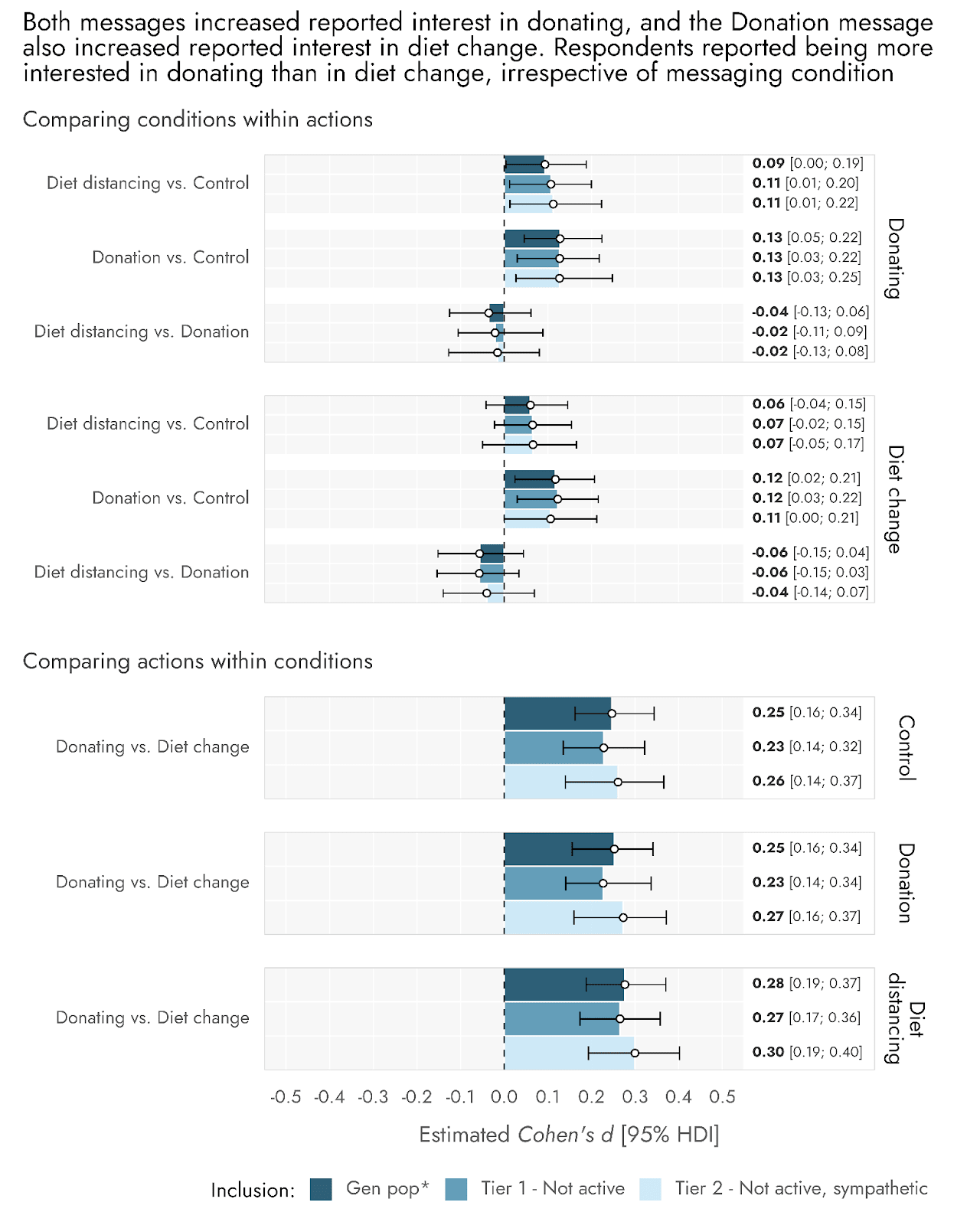 - Respondents reported being more inclined towards donating than diet change, whether or not they received a message (approximately 0.7 points from 1-10, or 0.23 to 0.30 SD units), and Donation messages very slightly increased reported interest in diet change (around 0.3 points from 1-10, or 0.09 to 0.13 SD units), with the Diet distancing message directionally the same but smaller in magnitude (around 0.1 or 0.2 scale points, or 0.06 to 0.07 SD units).