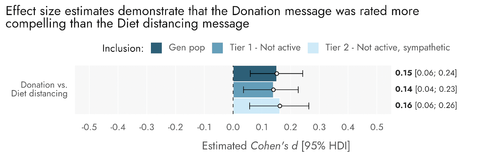 Figure 2: Effect size estimates demonstrate that the Donation message was rated more compelling than the Diet distancing message