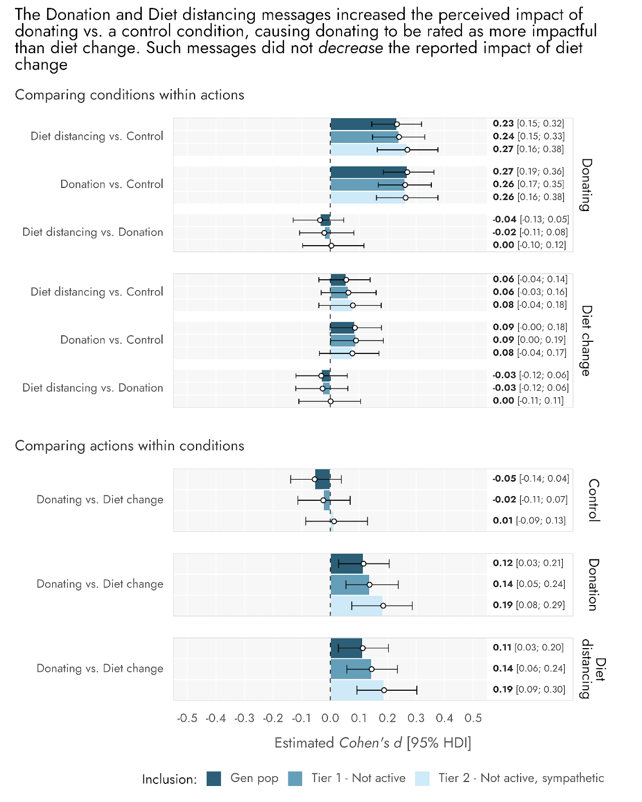 - Control respondents rated diet change and donating as equally impactful, and both messages increased the perceived impactfulness of donating. This shift was quite small at about 0.7 points on the 1-10 scale, or 0.23 to 0.27 SD units, but resulted in these groups rating donations as more impactful than diet change.