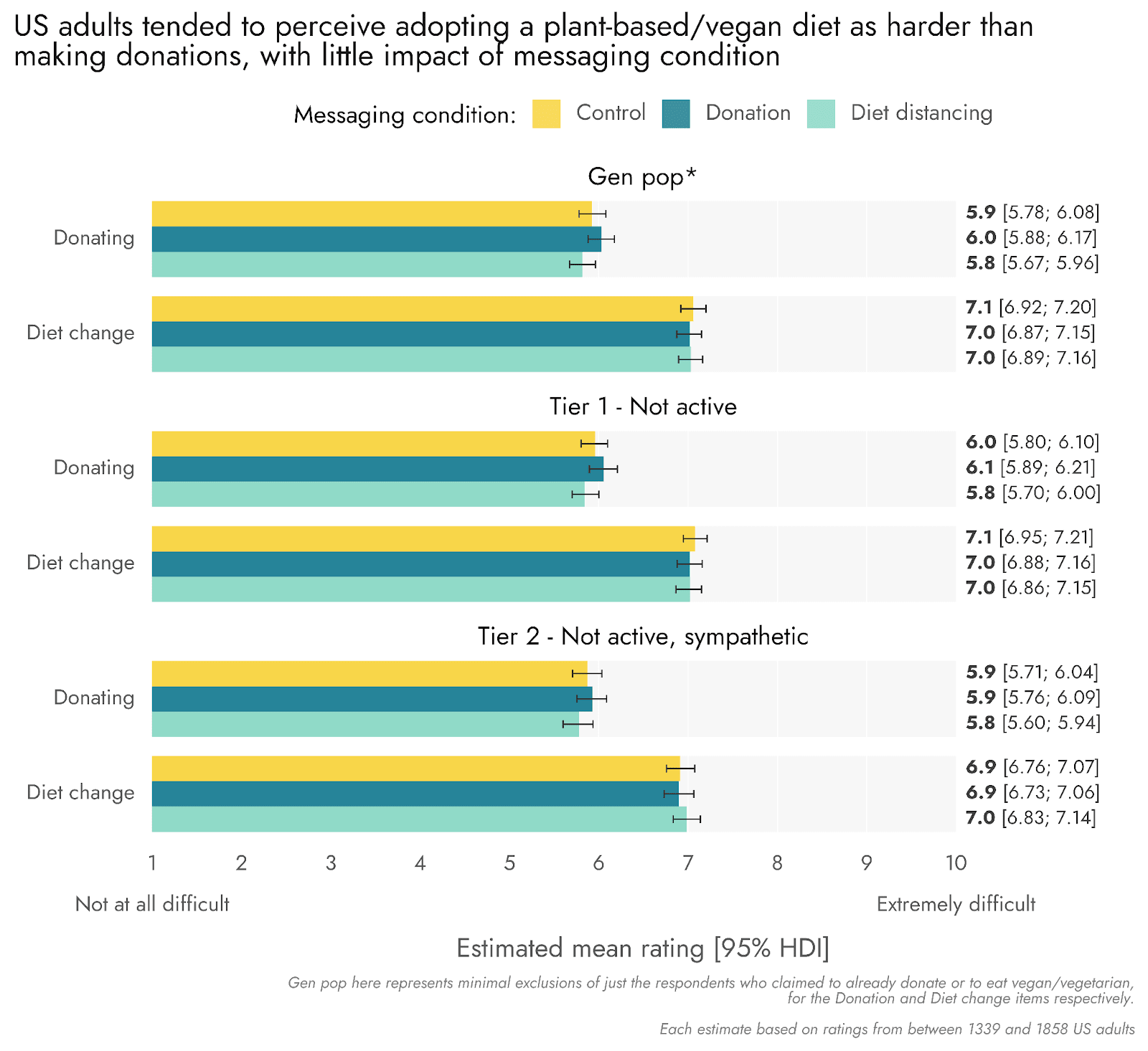 Figure 9: Neither message reliably impacted the reported difficulty of donating or of diet change, and respondents consistently rated donating as less difficult than diet change.