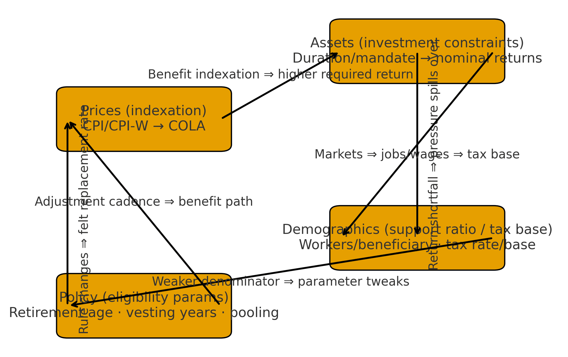 - (↔ Sec. VII) “No bankruptcy, proportional payout” and later-retirement/pooling stabilize the books, but felt replacement rates fall—trust collapses first.